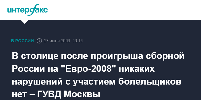 Москва. 27 июня. ИНТЕРФАКС - Никаких происшествий в Москве после проигрыша сборной России на "ЕВРО-2008" не зарегистрировано.