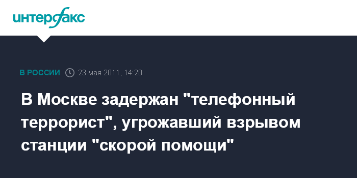 Москва. 23 мая. INTERFAX.RU - Мужчина, угрожавший взорвать станцию Скорой и неотложной помощи имени Пучкова и требовавший денег, задержан в Москве, сообщил "Интерфаксу" источник в правоохранительных органах.