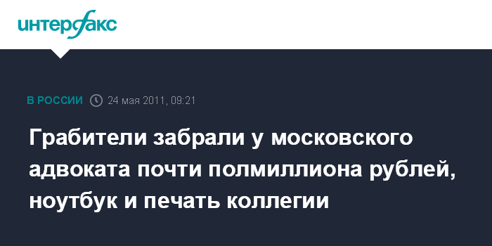 Москва. 24 мая. INTERFAX.RU - Адвокат ограблен на юго-востоке Москвы, сообщил "Интерфаксу" источник в правоохранительных органах во вторник.