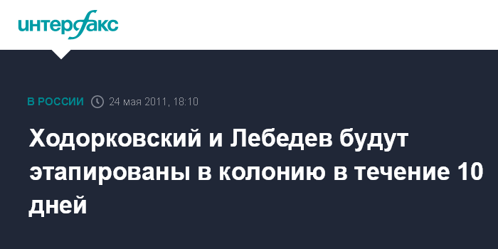 Москва. 24 мая. INTERFAX.RU - Бывший глава НК "ЮКОС" Михаил Ходорковский и экс-руководитель МФО "МЕНАТЕП" Платон Лебедев в ближайшее время должны быть этапированы к месту отбытия наказания в колонию.