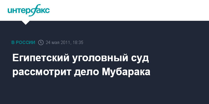 Каир. 24 мая. INTERFAX.RU - Дело о причастности бывшего президента Египта Хосни Мубюарака к убийству участников акций протеста решено передать в уголовный суд, сообщают во вторник местные официальные СМИ.