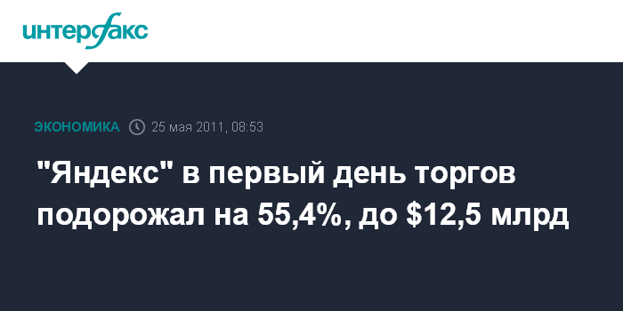 "Яндекс" в первый день торгов подорожал на 55,4%, до $12,5 млрд