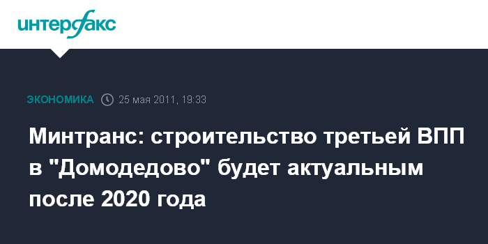 Москва. 26 мая. INTERFAX.RU - Минтранс признал необходимость строительства новой взлетно-посадочной полосы (ВПП) в "Домодедово" взамен ВПП-2, вопрос о строительстве третьей полосы в аэропорту станет актуальным после 2020 г., говорится в сообщении Минтранса.