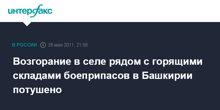 Нижний Новгород. 26 мая. INTWRFAX.RU - Пожар в жилом секторе вблизи горящих в Башкирии военных складов ликвидирован, сообщил агентству "Интерфакс-Поволжье" начальник пресс-службы Приволжского регионального центра МЧС Олег Зугеев.