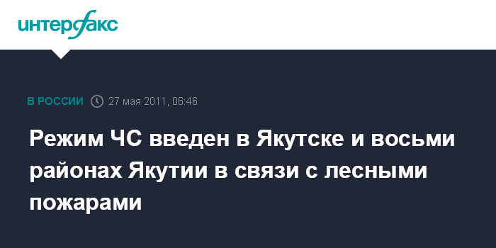 Ранее сообщалось, что режим ЧС в Якутии вводился в трех муниципальных районах указами муниципальных властей - в Амгинском, Намском и Таттинском. В пятнадцати районах республики и городе Якутске был введен особый противопожарный режим.