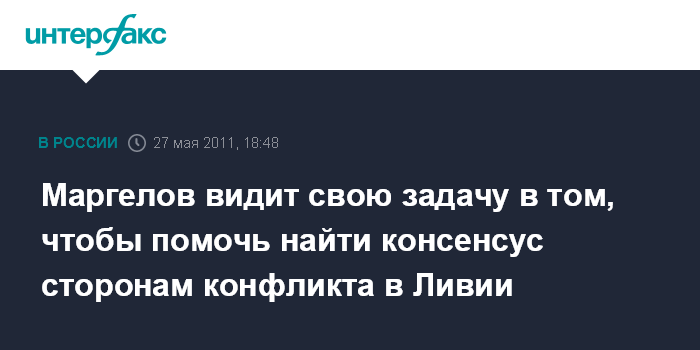 "Передо мной стоит задача встретиться с лидерами повстанцев и продолжить то, что Россия делает не первый месяц - способствовать тому, чтобы между ответственными представителями ливийской политической элиты, которые заинтересованы в том, чтобы Ливия сохранилась как единое независимое государство, играющее важную роль, как в арабском мире, так и в Африке, для того, чтобы помочь им найти пути к достижению национального консенсуса", - сообщил "Интерфаксу" по телефону Маргелов.