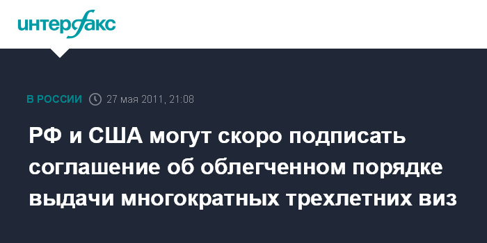 Москва. 27 мая. INTERFAX.RU - Россия и США, возможно, уже через два месяца подпишут соглашение об упрощении процедуры выдачи многократных трехлетних виз.