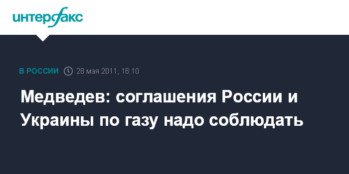 Д.Медведев заявил :"Хотел бы, чтобы Вы в будущем исходили из двух моментов". "Первый момент заключается в том, что мы должны соблюдать заключенное соглашение. Это относится и к Российской Федерации, к "Газпрому", это относится и к нашим украинским партнерам. И всякого роды призывы к односторонним мерам, каким-то пересмотрам, они должны быть наложены на ткань договоренностей. А не как иначе", - подчеркнул он.