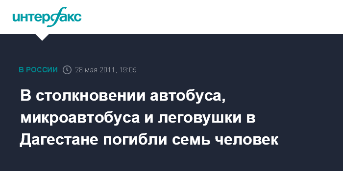 Как сообщает корреспондент "Интерфакса", на территории Карабудахкентского района Дагестана столкнулись пассажирский автобус "Короса", микроавтобус "Газель" и "Лада" ВАЗ-21014. "В результате автоаварии четыре человека погибли на месте, трое скончались в больнице. Еще четыре человека находятся в тяжелом состоянии", - сообщил журналистам начальник УГИБДД МВД Дагестана Валерий Громов.