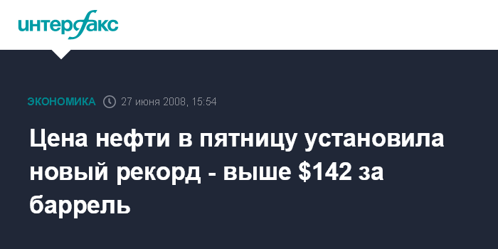 Москва. 27 июня. ИНТЕРФАКС-АНИ - Цена нефти в пятницу установила очередной рекорд, преодолев отметку в $142 за баррель, сообщило агентство Bloomberg.