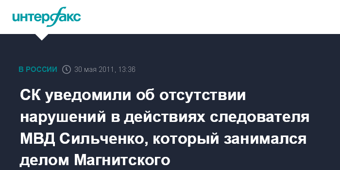 Москва.30 мая. INTERFAX.RU - Следственный комитет РФ получил ответ от Генпрокуратуры об отсутствии нарушений в действиях следователя СК при МВД Олега Сильченко при расследовании уголовного дела в отношении сотрудника фонда Hermitage Capital Сергея Магнитского.