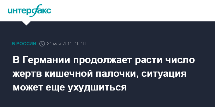 Лондон. 31 мая INTERFAX.RU - Число погибших от заражения кишечной палочкой E.coli в Германии достигло 14 человек, сообщает во вторник британская телерадиокорпорация BBC.
