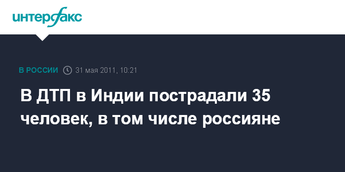 Дели. 31 мая. INTERFAX.RU - В Индии при столкновении рейсового автобуса Дхармсала-Дели с грузовиком во вторник 35 человек, в том числе 22 иностранных туриста из России, Италии, германии и Испании получили ранения средней тяжести.