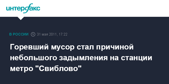 Москва. 31 мая. INTERFAX.RU - Дым от горевшего в коллекторе мусора затянул во вторник днем станцию "Свиблово" московского метрополитена, сообщил "Интерфаксу" источник в правоохранительных органах города.