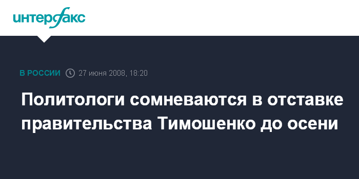Москва. 27 июня. INTERFAX.RU - Правительство Юлии Тимошенко не будет отправлено в отставку до осени, прогнозируют эксперты.