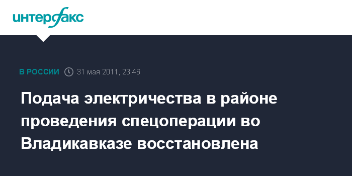 Владикавказ. 31 мая. ИНТЕРФАКС-ЮГ - Подача электричества восстановлена в семи многоквартирных домах во Владикавказе, расположенных в непосредственной близости от проводимой спецоперации по задержанию убийцы поэта Шамиля Джикаева.