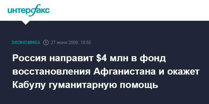 Москва. 27 июня. INTERFAX.RU - Россия намерена внести в 2008-2009 гг. $4 млн в многосторонний трастовый фонд на восстановление Афганистана, сообщил президент РФ Дмитрий Медведев.