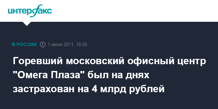 Москва. 1 июня. INTERFAX.RU - Горевший в среду московский офисный центр "Омега Плаза" был на днях застрахован на 4 млрд рублей в СК "Евро-Полис".