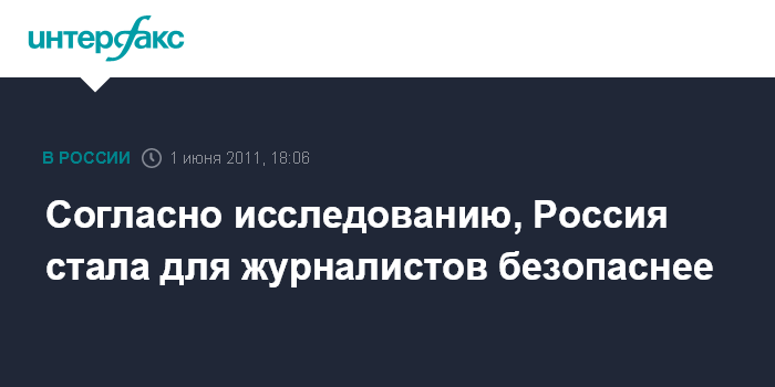 Вашингтон. 1 июня. INTERFAX.RU - Россия стала более безопасной страной для журналистов - в 2010 году, впервые с 1999 года, в стране не был убит ни один журналист в связи с профессиональной деятельностью, говорится в докладе, опубликованном на сайте правозащитной организации Committee of Concerned Journalists ("Комитет защиты журналистов").
