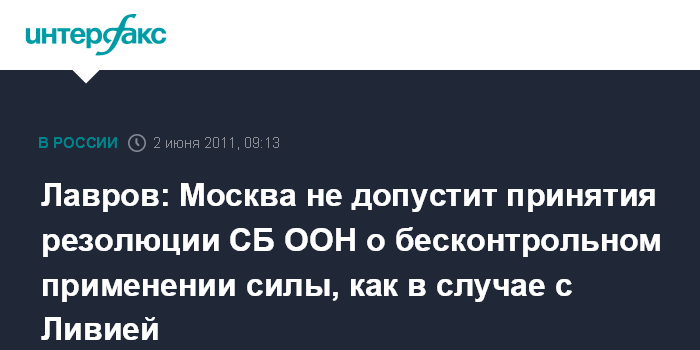 Москва. 2 июня. INTERFAX.RU - Россия больше не пропустит в СБ ООН резолюции, санкционирующие бесконтрольное применение силы, как это произошло в случае с Ливией. Москва будет настаивать, чтобы в документе детально прописывались границы применения силы, заявляет глава МИД РФ Сергей Лавров.