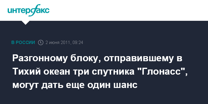 Москва. 2 июня. INTERFAX.RU - Разгонный блок ДМ-03, виновный в утрате трех навигационных спутников "Глонасс-М" в декабре 2010 года, может быть снова использован для запуска тройки "Глонассов" в конце этого года, сообщил "Интерфаксу-АВН" в четверг источник в ракетно-космической отрасли.