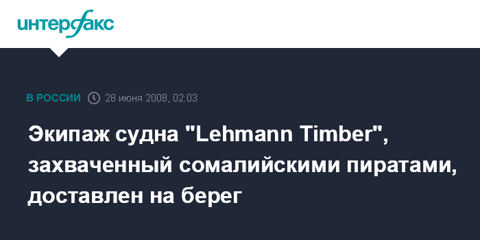 Киев. 28 июня. ИНТЕРФАКС-УКРАИНА - Почти весь экипаж судна "Lehmann Timber", захваченный ранее сомалийскими пиратами, доставлен на берег, сообщил 5 канал украинского телевидения вечером в пятницу со ссылкой на родственников захваченных моряков.