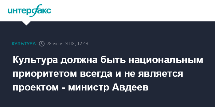 Ханты-Мансийск. 28 июня. INTERFAX.RU - Министр культуры России Александр Авдеев не считает, что развитию культуры в стране необходимо придавать статус национального проекта.