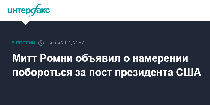 Вашингтон. 2 июня. INTERFAX.RU - Американский политик-республиканец Уиллард Митт Ромни объявил в четверг о планах баллотироваться на пост президента США в 2012 г., сообщает американский телеканал NBC.