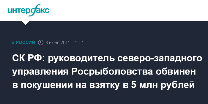 СК РФ: руководитель северо-западного управления Росрыболовства обвинен в покушении на взятку в 5 млн рублей