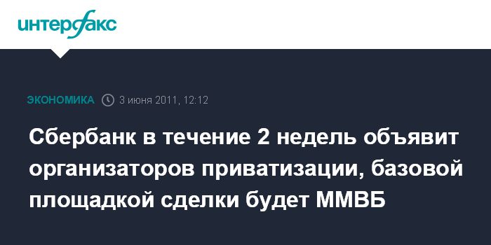 Сбербанк в течение 2 недель объявит организаторов приватизации, базовой площадкой сделки будет ММВБ