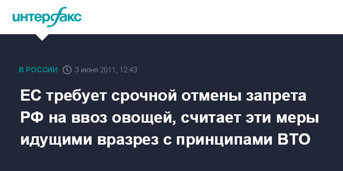 Москва.3 июня. INTERFAX.RU - Запрет Россией на ввоз всех овощей из всех стран-членов Евросоюза идет вразрез с принципами ВТО, куда Россия планирует вступить в ближайшем будущем, заявил представитель Евросоюза в Москве Фернандо Валенсуэла.