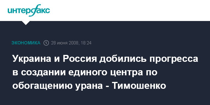 Москва. 28 июня. INTERFAX.RU - Украина и Россия продвинулись в создании единого центра по обогащению урана, заявила премьер Украины Юлия Тимошенко.