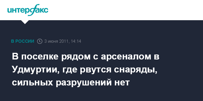 Нижний Новгород. 3 июня. INTERFAX.RU - По оценкам специалистов МЧС в удмуртском поселке Пугачево, который прилегает к 102-му арсеналу артиллерийских боеприпасов, где в результате пожара происходят взрывы снарядов, нет сильных разрушений.