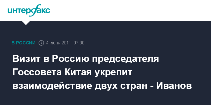 Визит в Россию председателя Госсовета Китая укрепит взаимодействие двух стран - Иванов