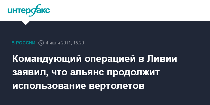 Брюссель. 4 июня. INTERFAX.RU - Вертолеты, впервые примененные НАТО в Ливии в субботу, показали уникальные атакующие свойства этих машин, заявил командующий операцией альянса "Объединенный защитник" генерал Шарль Бушар. "Мы продолжим использовать эти аппараты тогда и там, где это понадобится, применяя такую же точность действий, как и во всем в нашей миссии", - сказал Ш.Бушар.
