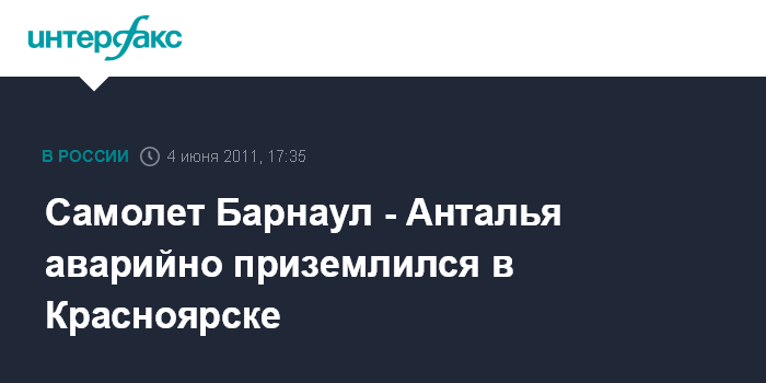 Барнаул. 4 июня. INTERFAX.RU - Самолет, вылетевший в субботу утром из города Барнаула (Алтайский край) в Анталью, аварийно приземлился в городе Красноярске, сообщили агентству "Интерфакс-Сибирь" в справочной службе барнаульского аэропорта. "Самолет совершил вынужденную посадку по причине технической неисправности. Что именно произошло с самолетом нам неизвестно. Никто из пассажиров не пострадал при посадке. Все они размещены в местных гостиницах", - сказали в справочной.