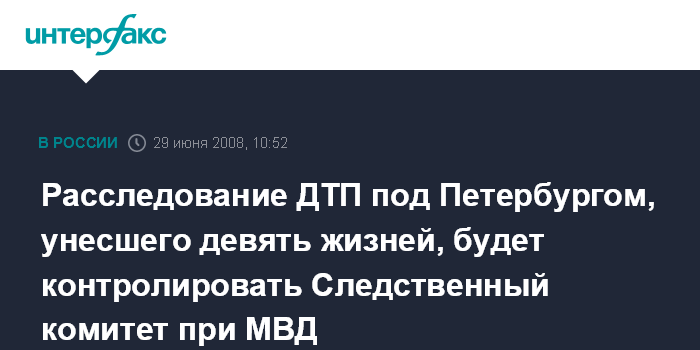 Москва/Санкт-Петербург. 29 июня. ИНТЕРФАКС - Следственный комитет (СК) при МВД России берет под контроль расследование обстоятельств дорожно-транспортного происшествия, произошедшего в воскресенье ночью в Ленинградской области, в результате которого погибли девять человек.