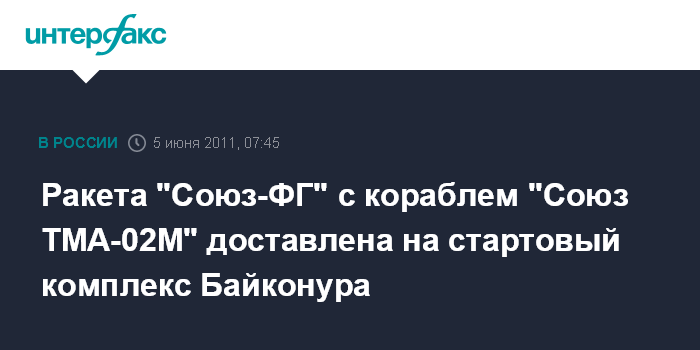 Пуск ракеты-носителя "Союз-ФГ" с кораблем "Союз ТМА-02М" намечается на 8 июня в 00:13 мск. На корабле на Международную космическую станцию (МКС) полетит экипаж в составе россиянина Сергея Волкова, японца Сатоси Фурукавы и американца Майкла Фоссума.