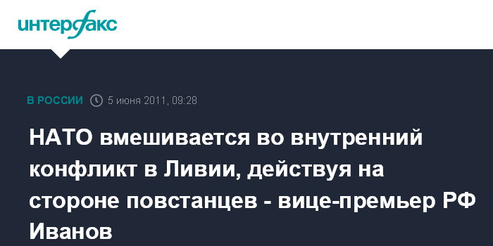 "Как заявил президент России Дмитрий Медведев, поддержав резолюцию Совета Безопасности ООН, мы исходили из того, что ее принятие направлено на укрепление мира, недопущение эскалации конфликта и гибели гражданского населения, - сказал С.Иванов.- Однако действия НАТО, которые прикрываются произвольным толкованием резолюций СБ ООН, нельзя охарактеризовать иначе, чем вмешательство в гражданскую войну на стороне одной из противоборствующих группировок".
