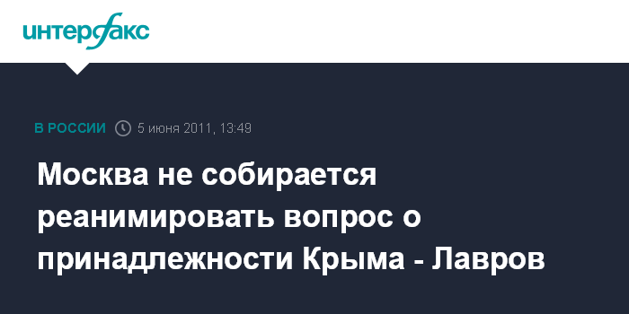 Москва. 5 июня. INTERFAX.RU - Глава МИД России Сергей Лавров заявил, что возвращение к вопросу о принадлежности Крыма "никому не нужно". "Очаковские времена, покорение Крыма, это все уже в прошлом. Президенты Ельцин, Путин, Медведев последовательно высказывались о статусе Крыма. У каждого из нас могут быть реминисценции, ностальгические воспоминания, но любой ответственный и нормальный человек должен понимать, что реанимация вопроса о принадлежности Крыма - это кровь, это никому не нужно", - сказал он в эфире радиостанции "Эхо Москвы".