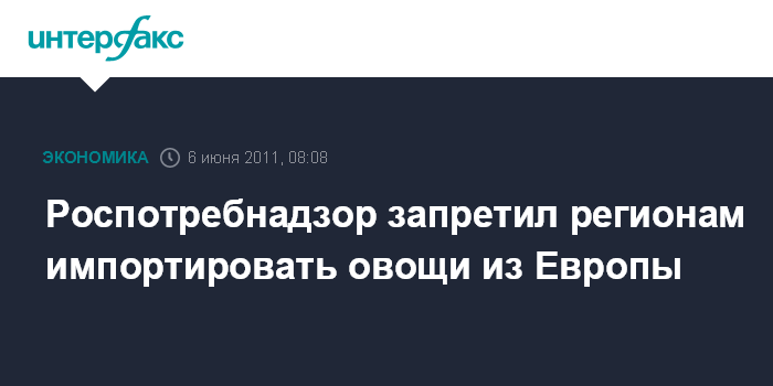 Москва. 6 июня. INTERFAX.RU - Роспотребнадзор направил в Федеральную таможенную службу распоряжение, в котором просит не допускать ввоза на территорию России овощей из Европы, говорится в сообщении, размещенном в пятницу на сайте ведомства. В документе также отмечается, что "источник возникновения групповой заболеваемости до сих пор не определен".