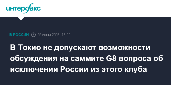 Москва. 29 июня. ИНТЕРФАКС - В Токио считают невозможным включение вопроса о членстве России в "большой восьмерке" в повестку дня саммита G8 на Хоккайдо.