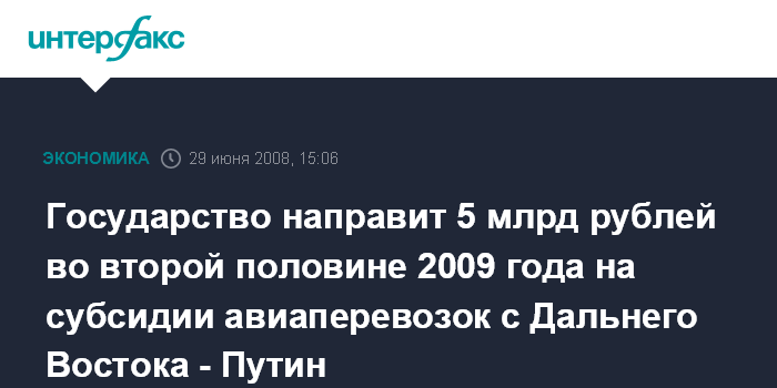 Пансионат "Лесные дали" (Московская область), 29 июня. ИНТЕРФАКС - Премьер-министр РФ, лидер "Единой России" Владимир Путин сообщил, что государство будет субсидировать авиаперевозки с Дальнего Востока в центральную часть страны.