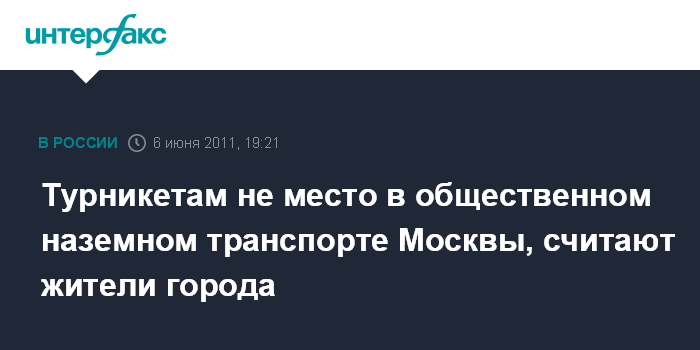 Москва. 6 июня. INTERFAX.RU - Согласно опросу, проведённому исследовательским центром рекрутингового портала Superjob.ru, более половины москвичей считают, что турникетам не место в московских автобусах, троллейбусах и трамваях.