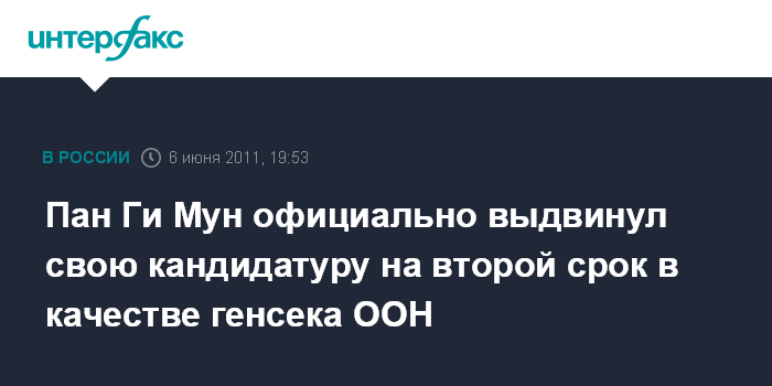 Нью-Йорк. 6 июня. INTERFAX.RU - Генеральный секретарь ООН Пан Ги Мун в понедельник объявил о решении переизбираться на второй срок.