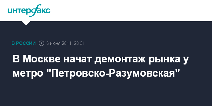Москва. 6 июня. INTERFAX.RU - Рынок ТИАС, расположенный возле станции московского метро "Петровско-Разумовская", освободил место для строительства нового вестибюля метро, сообщили "Интерфаксу" в пресс-службе департамента торговли и услуг в понедельник.