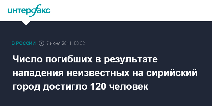 Каир. 7 июня. INTERFAX.RU - Минимум 120 человек погибли в результате нападения сотен вооруженных людей на сирийский город Джиср-эш-Шихр, сообщило местное государственное телевидение.
