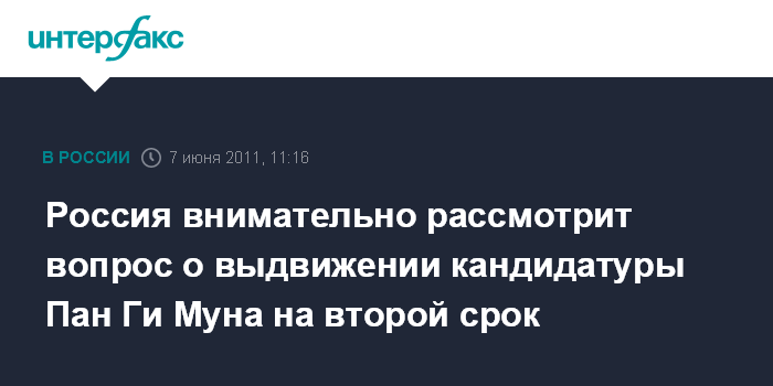Москва. 7 июня. INTERFAX.RU - В Москве рассматривают вопрос о поддержке кандидатуры Пан Ги Муна на второй срок на посту генерального секретаря ООН.