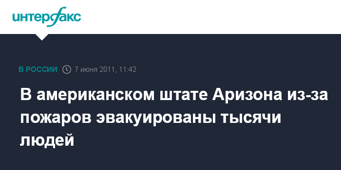 Вашингтон. 7 июня. INTERFAX.RU - Власти штата Аризона на юго-западе США эвакуировали из района лесных пожаров 3 тыс. человек, сообщил телеканал CNN со ссылкой на представителя местного отделения Красного Креста Марка Уэлдона.