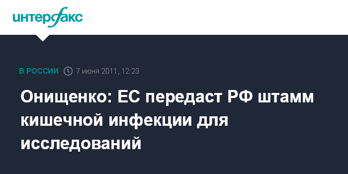Москва. 7 июня. INTERFAX.RU - Евросоюз предоставит российским медикам штамм кишечной инфекции, вспышка которой отмечена в ряде европейских стран, прежде всего, в Германии.